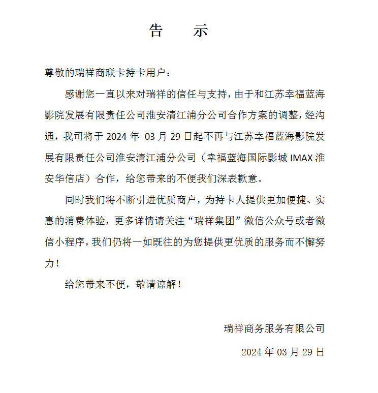 關(guān)于淮安幸福藍(lán)海華信店暫停合作公告